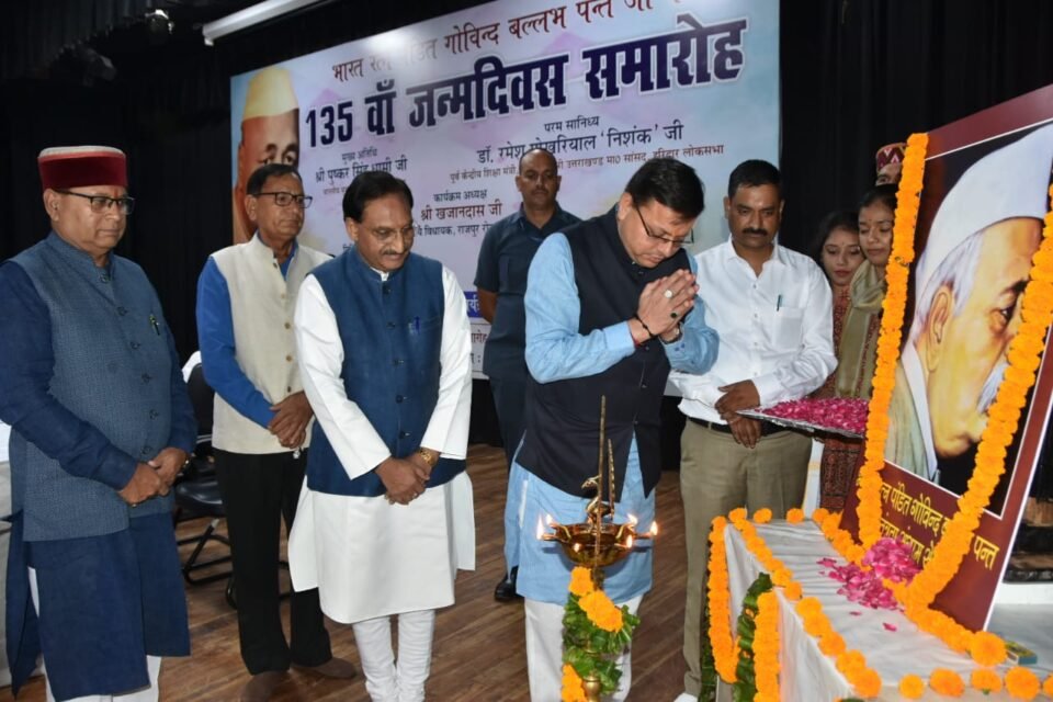 मुख्यमंत्री पुष्कर सिंह धामी ने सर्वे चौक स्थित आई.आर.डी.टी. सभागार में भारत रत्न पं. गोविन्द बल्लभ पंत जी के 135 वें जन्मदिन समारोह कार्यक्रम में प्रतिभाग किया। इस अवसर पर उन्होंने पं. गोविन्द बल्लभ पंत के चित्र पर श्रद्धासुमन अर्पित कर उन्हें श्रद्धांजलि दी।