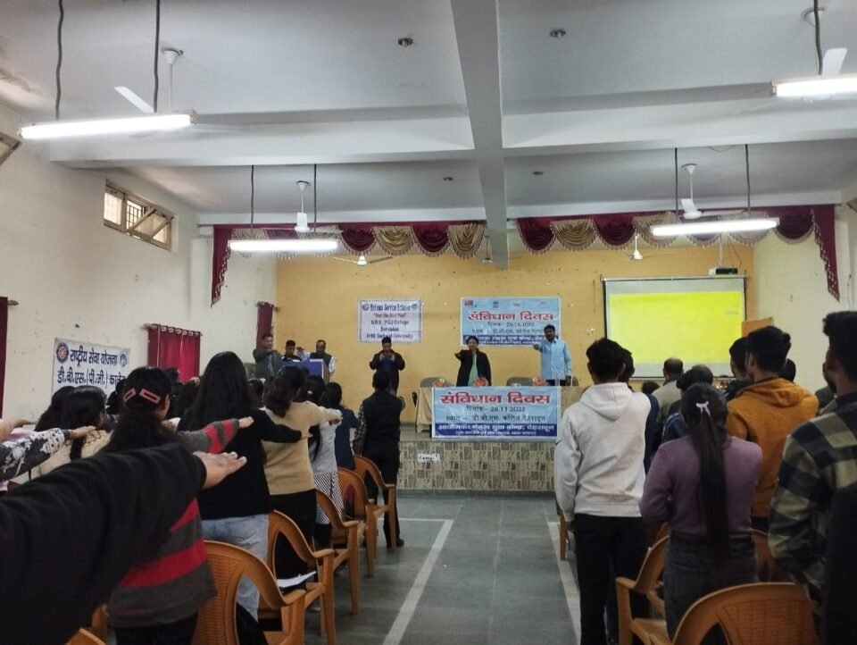 जिला युवा अधिकारी नेहरू युवा केन्द्र देहरादून एम0 टोलिया ने अवगत कराया है कि युवा कार्यक्रम एवं खेल मंत्रालय, भारत सरकार के तत्वावधान में डी0 बी0 एस0 कालेज, देहरादून के सभागार में 26 नवंबर 2022 को संविधान दिवस कार्यक्रम का आयोजन किया गया कार्यक्रम के मुख्य अथिति डॉ0 वी0सी0पाण्डे प्रचार्य डी0बी0एस0 कालेज के द्वारा द्वीप प्रज्जवलन कार कार्यक्रम का शुभआरम्भ किया गया। कार्यक्रम के अन्तर्गत संविधान की कहानियॉं,मौलिक कर्तव्य और दायित्व,प्रश्नोत्तरी एवं वार्तालाप गतिविधियों का आयोजन किया किया गया है। कार्यक्रम में राष्ट्रीय सेवा योजना के स्वयं सेवक एवं नेहरू युवा क्लब के 75 युवाओ द्वारा प्रतिभाग लिया गया इस अवसर पर कार्यक्रम अधिकारी डॉ विघुत बॉस द्वारा सविधान के मौलिक कर्तब्य और अधिकारो के बारे मे युवाओ को जानकारी दी गई डॉ शैली द्वारा प्रतिभागियो को पी0पी0टी0 के माध्यम से सविधान के बारे विस्तिरित जानकारी दी गई। इस अवसर पर उप प्राचार्य डॉ अनिल कुमार पाल,डॉ अराधना शर्मा द्वारा सविधान के बारे में युवाओ के सामाने अपने विचार रखे।और युवाओ द्वारा भी खुली चर्चा की गई बतौर मुख्य अथिति डॉ0 वी0सी0पाण्डे द्वारा युवाओं को सविधान दिवस पर डॉ0 भीमराव अम्बेडकर के योगदान के बारे में जानकारी दी गई कार्यक्रम का संचालन श्री अभिशेक द्वारा किया गया।